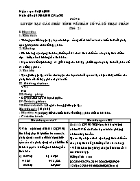 Ngày soạn: 04/04/2010 Ngày giảng: 06/04/2010 (6A; 6B) Tiết 92: Luyện tập các phép tính về phân số và số thập phân (Tiết 2) I. Mục tiêu: 1. Kiến thức: - Thông qua tiết luyện tập học sinh được củng cố và khắc sâu các kiến thức về phép cộng, trừ, nhân chia số thập phân. 2. Kỹ năng: - Có kĩ năng vận dụng linh hoạt kết quả đã có và tĩnh chất của các phép tính để tìm được kết quả mà không cần tính toán. - Học sinh biết định hướng và giải đúng các bài tập phối hợp các phép tính về phân số và số thập phân. 3. Thái độ: - Qua giờ luyện tập nhằm rèn luyện cho học sinh về quan sát, nhận xét đặc điểm các phép tính về số thập phân và phân số. II . Đồ dùng dạy học: GV: HS: III.Phương pháp: - Dạy học tích cực và học hợp tác. IV.Tổ chức giờ học: *Kiểm tra bài cũ: Lồng vào trong giờ luyện tập. Hoạt động 1: (15 phút) . Mục tiêu: Vận dụng tốt các kiến thức về số thập phân để làm bài toán. . Cách tiến hành: Hoạt động của GV Hoạt động của HS GV đưa nội dung đề bài 112 (SGK) lên bảng phụ Hãy kiểm tra xem các phép cộng sau đây rồi sử dụng kết qủa của các phép cộng này để điền số thích hợp vào ô trống mà không cần tính toán a) 2678,2 b) 36,05 + 126 + 13,124 2804,2 49,246 c) 2804,2 d) 126 + 36,05 + 49,264 2840,25 175,246 e) 678,27 g) 3497,37 +2819,1 + 14,02 3497,37 3511,39 Bài 112: (SGK-T49) Học sinh hoạt động nhóm GV tổ chức cho học sinh hoạt động nhóm với yêu cầu. Quan sát, nhận xét và vận dụng tính chất của các phép tính để ghi kết quả vào ô vuông. - Giải thích miệng từng câu (mỗi nhóm cử 1 em trình bày). Kết quả như sau: (36,05+2678,2)+126=36,05+(2678,2+ 126)=36,05+2804,2=2840,25 (theo a) (126+36,05)+13,214 = 126 + (36,05 + 13,214)=126+49,264+175,264(theo d) (678,27+14,02)+2819,1=(678,27+ 2819,1)+ 14,02=3497,37+14,02 =3511,39 (theo g) 4947,37 - 678,25 =2819,1 (theo e) Hoạt động 2: (15 phút) . Mục tiêu: Vận dụng tốt các kiến thức về số thập phân để làm bài tập. . Đồ dùng dạy học: Bảng phụ. . Cách tiến hành: Hoạt động của GV Hoạt động của HS GV treo bảng phụ ghi sẵn bài tập 113. Hãy kiểm tra các phép nhân sau rồi sử dụng kết quả để điền số thích hợp vào ô trống mà không cần tính toán. a) 37.47 =1833 b) 15,6 . 7,02= 109,512 c) 1833. 3,1 = 5682,3 d) 109,521. 5,2 = 569,4624 Bài 113: (SGK-T50) Tính (3,1.47).39=3,1.(47.39)=3,1.1833(theoa = 5682,3 (theo c) (15,6.5,2). 7,02= (15,6.7,02).5,2 = 109,512.5,2 (theo b)=569,4624 (theo d) 3682,3: (3,1.4,7) =(5682,3.3,1):47 = 1833: 47 (theo c)= 39 (theo a) Hoạt động 3: (13 phút) . Mục tiêu: Vận dụng thành thạo các phép tính về phân số và số thập phân để làm bài tập. . Cách tiến hành: Hoạt động của GV Hoạt động của HS Bài 114: Tính Em cho biết bài tập trên gồm những phép tính nào ? Ta cần thực hiện phép tính gì ? Bài 114: (SGK) Tính (-3,2). ( =: = * HDVN: (02 phút) - Ôn lại các kiến thức đã học từ đầu chương III - Các qui tắc, công thức đã học - Xem lại các bài tập đã chữa. - Làm hết các bài tập còn lại phần luyện tập (T48, 49) - Tiết sau kiểm tra 1 tiết. Ngày soạn: 06/04/2010 Ngày giảng: 08/04/2010 (6A; 6B) Tiết 93: Kiểm tra 1 tiết I.Mục tiêu: - Nhằm đánh giá mức độ nắm vững 1 cách hệ thống về phân số, phân số bằng nhau, rút gọn phân số, cộng trừ nhân chia phân số. Nắm vững và hiểu khái niệm phân số, hỗn số, số thập phân, phần trăm. - Giúp GV thông tin để đánh giá về mức độ thành thạo, kĩ năng tính đúng, nhanh, vận dụng linh hoạt các định nghĩa, tính chất vào giải toán nhất là giải toán về phân số. - Rèn luyện tính kiên trì, linh hoạt cẩn thận, chính xác các phán đoán và lựa chọn phương pháp hợp lý của từng học sinh II. Đề bài: A.Trắc nghiệm khách quan: 1. Điền số thích hợp vào ô vuông = ; ; 2. Từ đẳng thức (-7).24 = 21.(-8) cặp phân số bằng nhau là: A. B. C. D. 3. Số nghịch đảo của là: A. B. -9 C. 9 D. 1 4. Nếu x – 1 = thì x bằng: A. B. C. D. 0 5. Trong các phân số: phân số nhỏ nhất là: A. B. C. D. 6. Viết dưới dạng phần trăm, ta được: A. 3,5% B. 35% C. 350% D. 3500% B.Phần tự luận: Câu7: Tính giá trị của biểu thức: A= -1,8 : + ; b) B = Câu8:Tìm x biết:a) ; b) (-3)2 + = (-5)2 Câu9: Viết phân số dưới dạng tổng của ba phân số có tử bằng 1 và mẫu khác nhau III.Đáp án và thang điểm: A.Trắc nghiệm khách quan: 3 điểm ( mỗi câu 0,5 điểm) Câu1: 8 ; -20; -5; -15; 30 Câu2: B; 3: B; 4: A; 5: D; 6: C B.Tự luận: 7 điểm Câu7: A= -1,8 : + ==(1.5 đ) B = = (1,5 đ) Câu8: a) ( 1,5 đ) b)(-3)2 + = (-5)2 (1,5 đ) Câu9: 1điểm Có nhiều cách làm: Ta có: Ngày soạn: 06/04/2010 Ngày giảng: 09/04/2010 (6A; 6B) Tiết 94: Đ14 Tìm giá trị phân số của một số cho trước I. Mục tiêu: 1. Kiến thức: - Học sinh nhận biết và hiểu qui tắc tìm giá trị phân số của 1 số cho trước 2. Kỹ năng: - Có kĩ năng vận dụng qui tắc đó để tìm giá trị phân số của 1 số cho trước. 3. Thái độ: - Có ý thức áp dụng qui tắc này để giái 1 số bài toán thực tiễn. II . Đồ dùng dạy học: III.Phương pháp: IV.Tổ chức giờ học: Hoạt động 1: Tìm tòi phát hiện kiến thức mới. (15 phút) . Mục tiêu